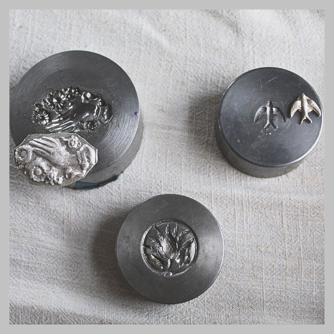 Through careful restoration and the limited reissue of dies by Potter USA, these historic artworks find new form in my studio. I press them by hand into reclaimed silver and copper, and now brass and lead-free pewter, bridging the creativity of the past with the purpose of the present.
