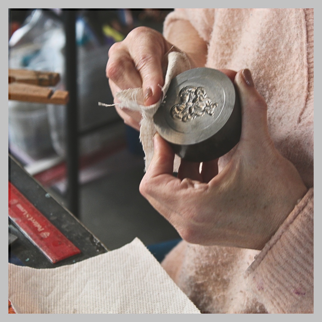 Now, through careful restoration and the limited reissue of dies by die-maker Potter USA, I give this artwork new life in reclaimed silver, copper, brass, and now pewter — uniting the imagination of the past with the intention and lived experience of the women who wear it now. No industrial machines, no mass production, just the steady rhythm of hands and shoulders bringing legacy back to life.