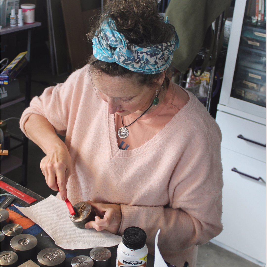 Phoenix Silver pieces represent transformation and personal power. Derived from a journey of personal rebirth, my brand stands as a beacon for women seeking to celebrate or share their own narratives of triumph, resilience, and self-discovery. My jewelry is made with muscle, a 20-ton press, and dies made by PotterUSA with the latest technology, reproducing 100 year old hand-carved hubs. My mission includes helping to save these gorgeous carvings through my work. The dies contain symbols of strength, resilience, beauty, intellect, and interest over the ages. The symbolic artwork imbues my work with meaning and resonates with my beautiful customers.