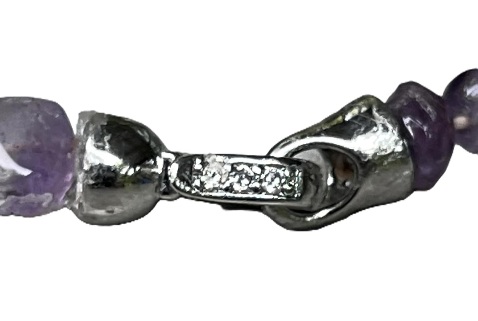 Details: 4–8mm amethyst beads, hand-knotted pink silk, 18k white gold plated clasp with CZ, bead source: Brazil via Tucson Gem Show, finished length: 18".