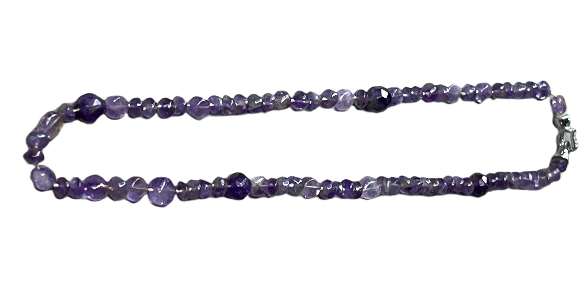 A strand of smooth 4mm saucer- and disc-shaped amethyst beads in shifting shades of lilac and violet, knotted on blush silk and finished with 10mm dark purple faceted rounds. Amethyst has always been the stone of intuition, calm, and spiritual clarity, said to steady the mind and ward off negativity.