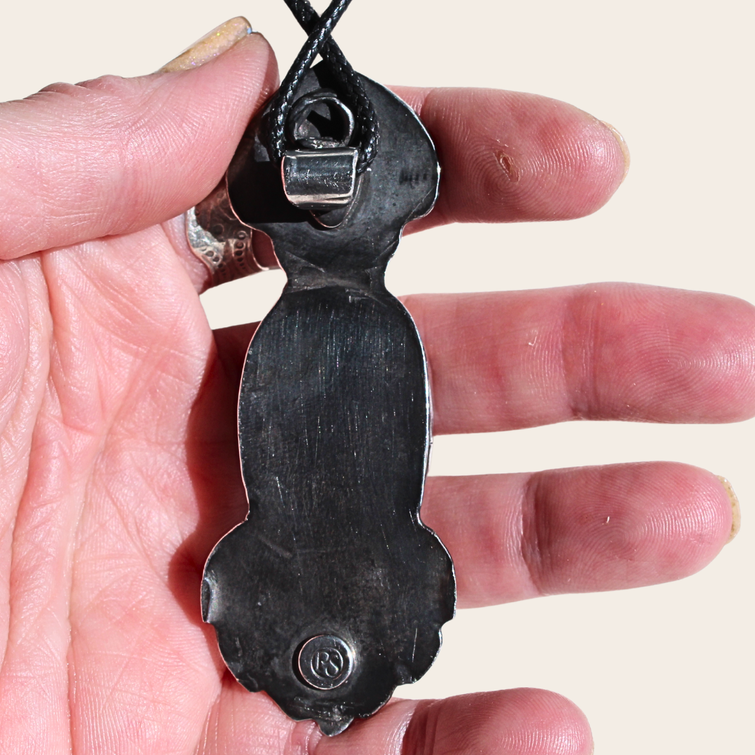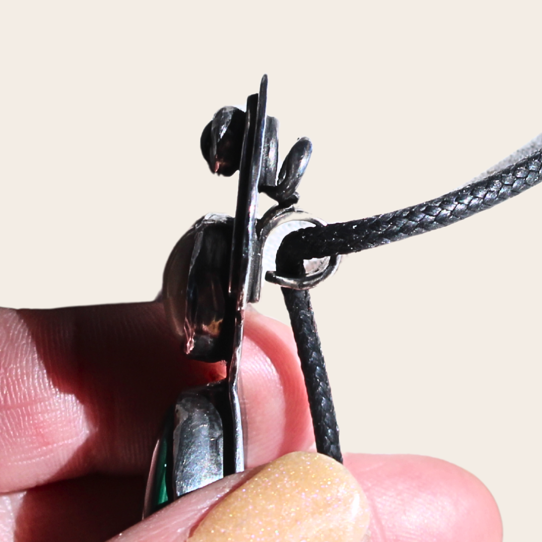 Four gemstones stacked like a prayer. Peridot, yellow opal, malachite, amethyst. Each one a different flame. Topped and bottomed with pewter onion domes—borrowed from Russian Orthodox architecture—this talisman is a vertical devotion.