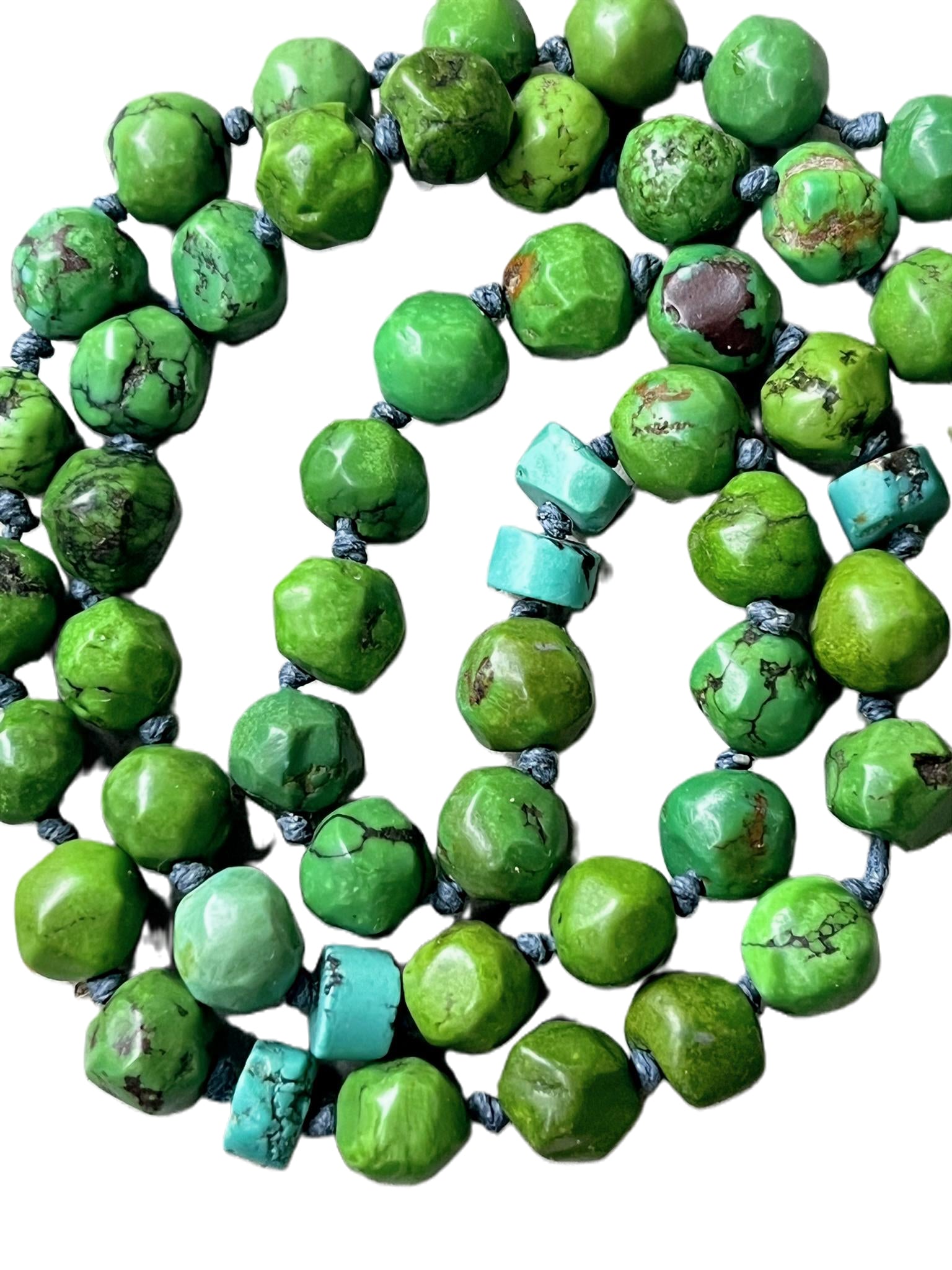 Hand-faceted turquoise rounds from Afghanistan, polished to a smooth satin finish and threaded with scattered bright blue heishi beads. The mix of greens and contrasting blues with its natural matrix makes this strand feel both ancient and alive.